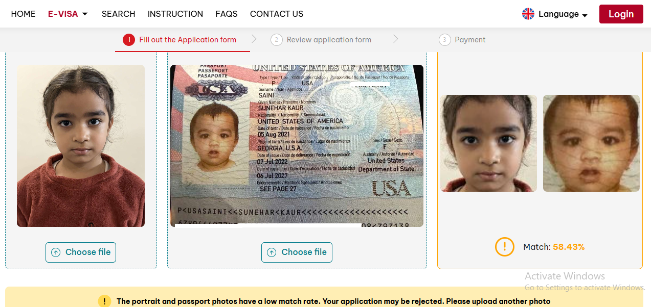 The Vietnam eVisa system uses automatic facial recognition technology, and it can be quite strict. Reasons for a low photo match rate: The portrait photo is blurry, or the passport photo page is blurry. The passport was issued many years ago, so