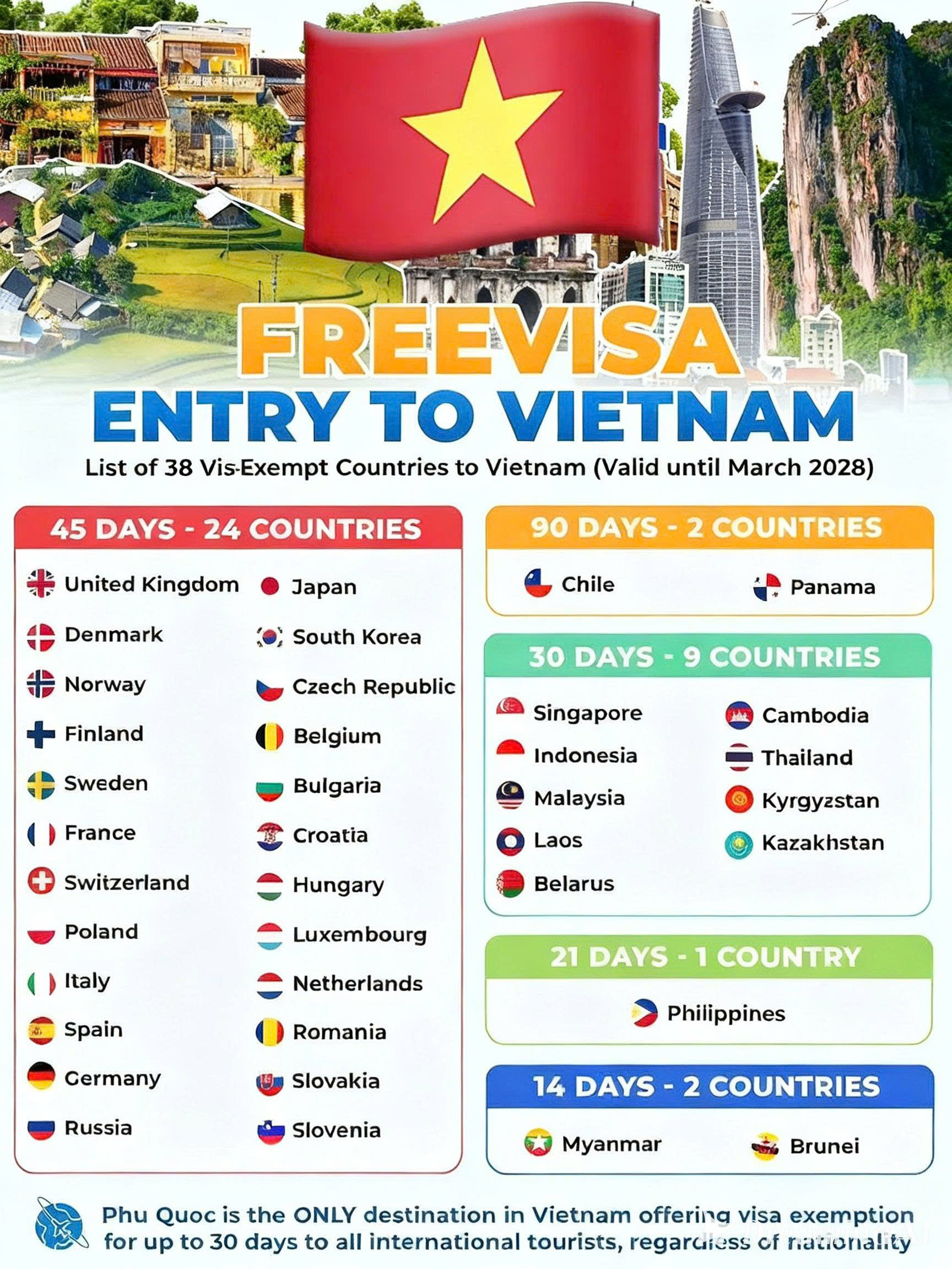 Foreign passport holders whose countries are included in Vietnam’s visa exemption list may enter Vietnam without a visa for a limited period of stay. Please note that this exemption list may change from time to time, so it is important to review